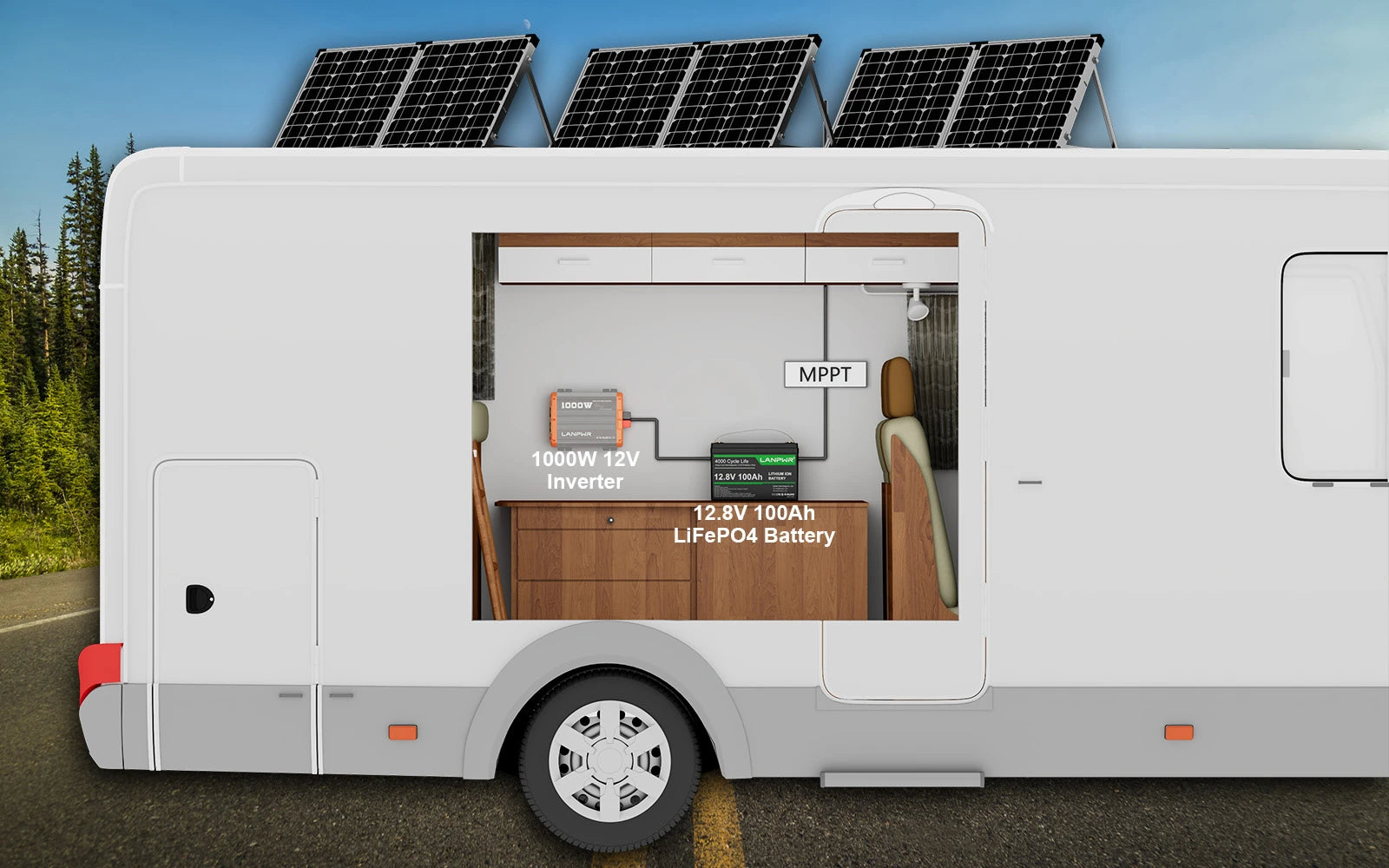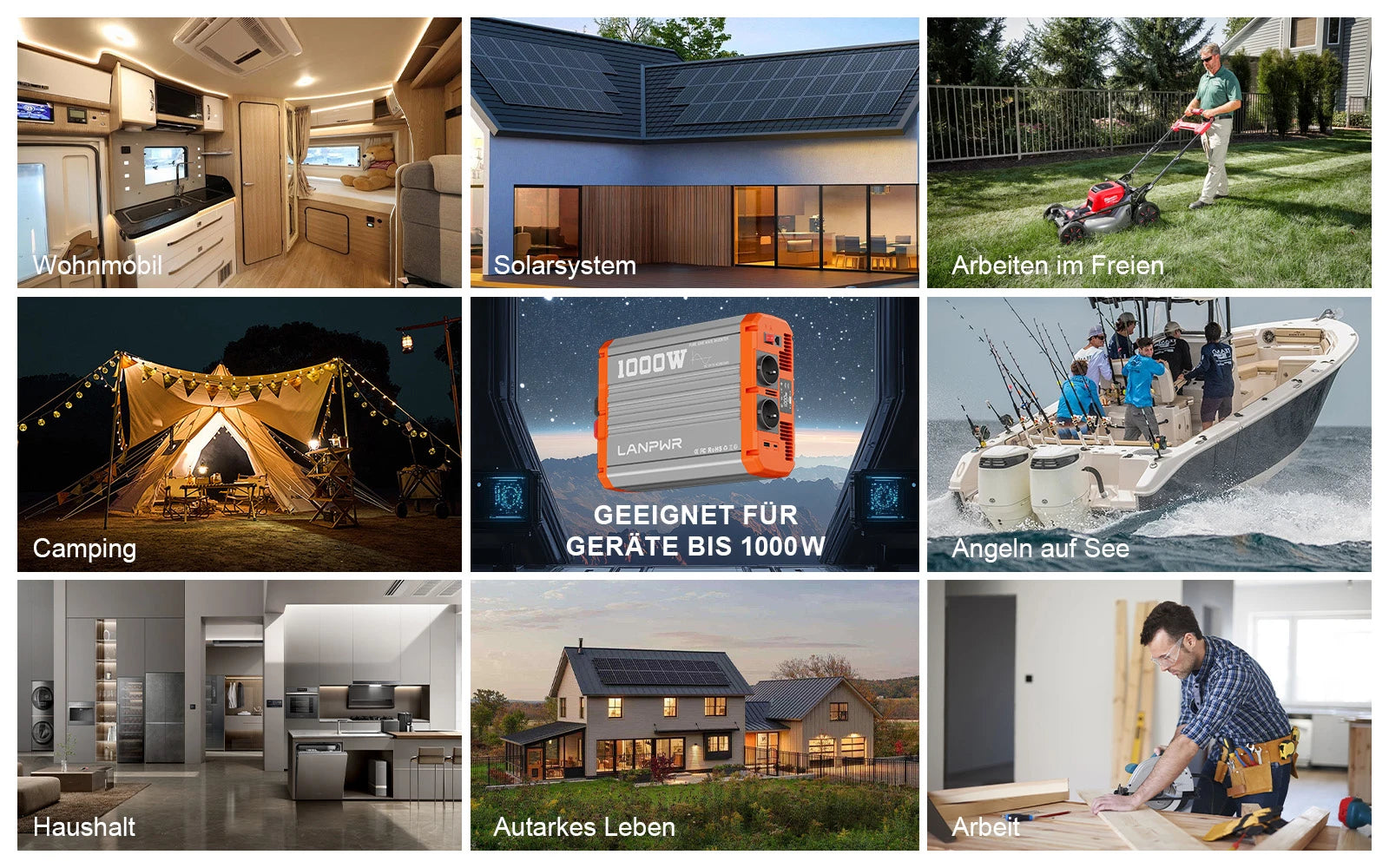 Dieser LANPWR 1000 W 12 V Wechselrichter verfügt über eine hohe Kompatibilität und passt perfekt zu Blei-Säure-, Lithium-Ionen- und anderen 12 V-Batterietypen. So werden die vielfältigen Energieanforderungen für Outdoor-Abenteuer, Notfälle zu Hause, netzunabhängiges Leben und gewerbliche Anwendungen optimal abgedeckt. Während eine stabile Stromversorgung gewährleistet wird, bietet er zudem einen Batterieschutz, der die Lebensdauer der Batterie effektiv verlängert.