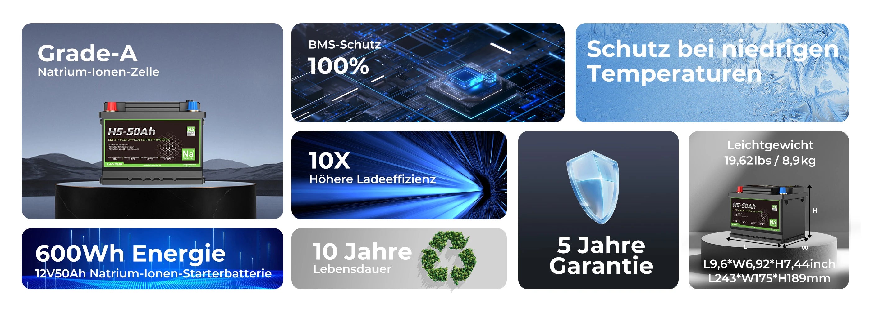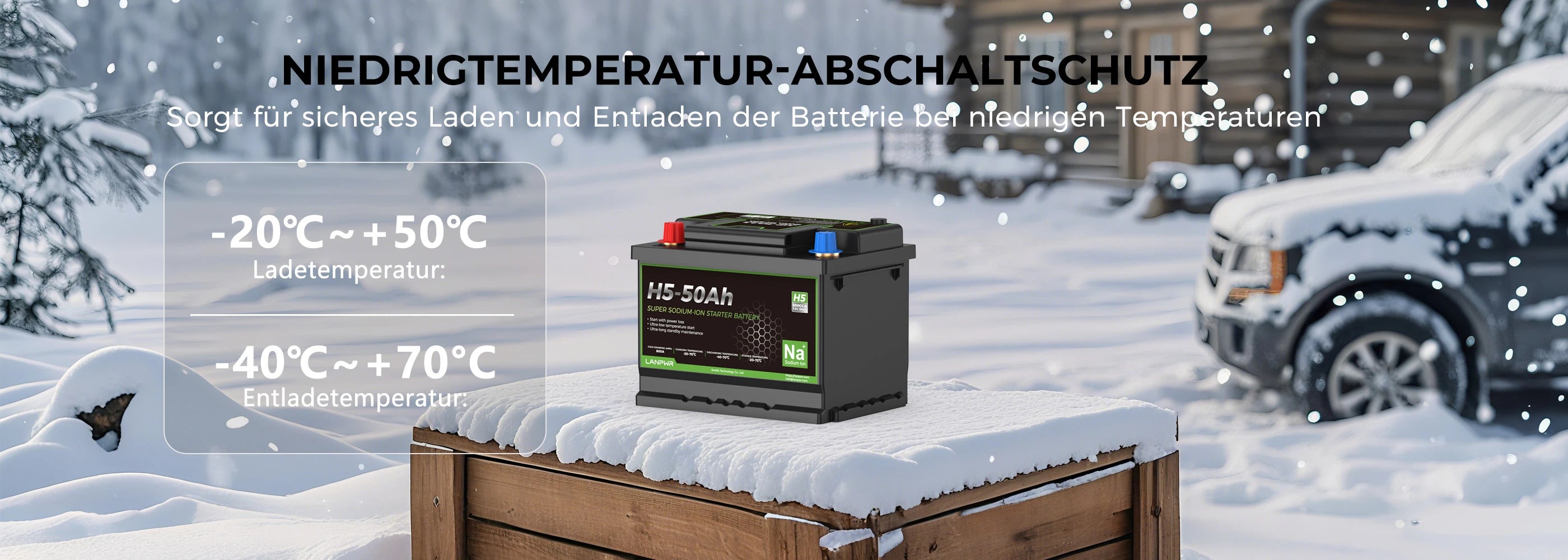 LANPWR 12 V 50 Ah Natrium-Ionen Starterbatterie – extrem kältebeständig, liefert 800 A CCA für verlässliche Winterstarts. Kompakt, leistungsstark und umweltfreundlich, ideal für moderne Fahrzeuge und Wasserfahrzeuge.