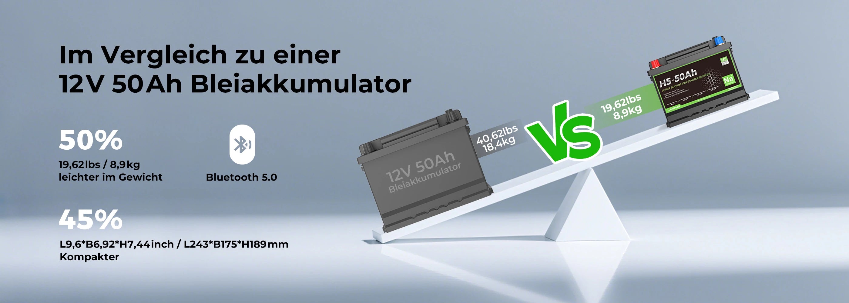 ✅ Leichteres Gewicht – nur 8,9 kg, 40 % leichter als vergleichbare Blei-Säure-Batterien.