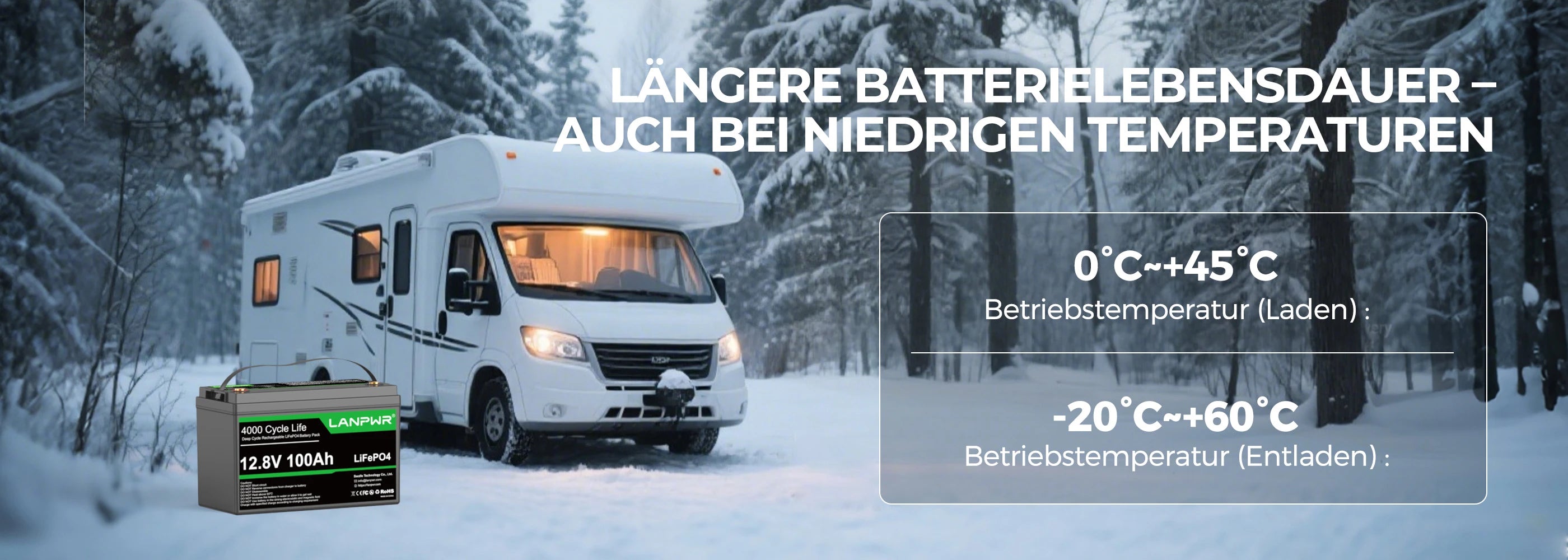 Für das Laden bei Gefriertemperaturen: Wenn Ihre Anwendung das Laden bei Minusgraden erfordert (z. B. im Winter mit dem Wohnmobil, in abgelegenen Hütten), sollten Sie unsere LANPWR Kaltwetter-Batterien in Betracht ziehen. Diese fortschrittlichen Batterien verfügen über ein eingebautes System (Schutz vor dem Laden bei niedrigen Temperaturen), das das Laden bei Kälte automatisch verwaltet und Ihre Investition schützt.