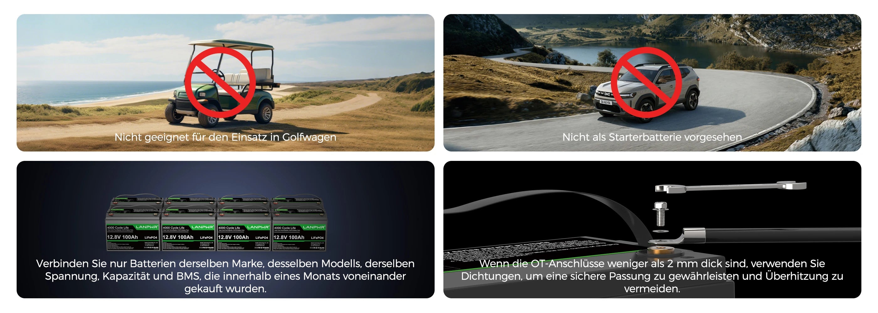 - Identische Modelle: Alle verwendeten Batterien sollten das exakt gleiche Modell (z. B. LANPWR 12V 100Ah) mit gleicher Kapazität (Ah) und derselben BMS-Bewertung (A) sein.