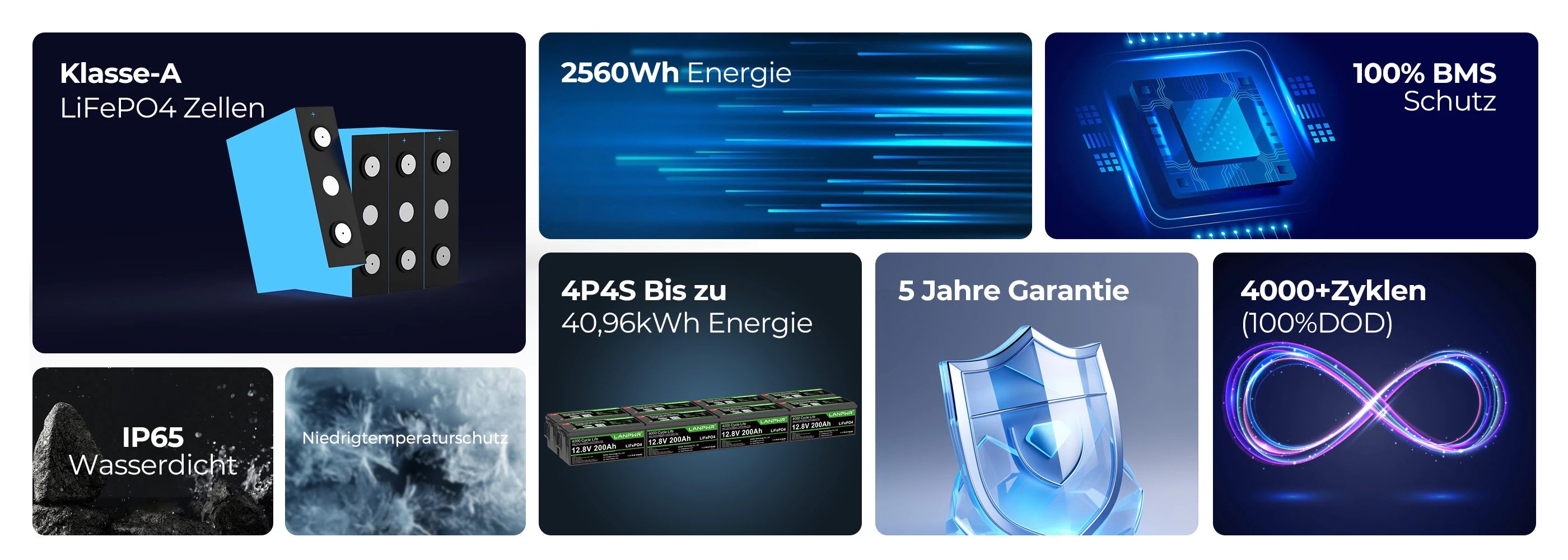 - EV Grade-A LiFePO4 Zellen, 4000+ Zyklen bei 100% DOD