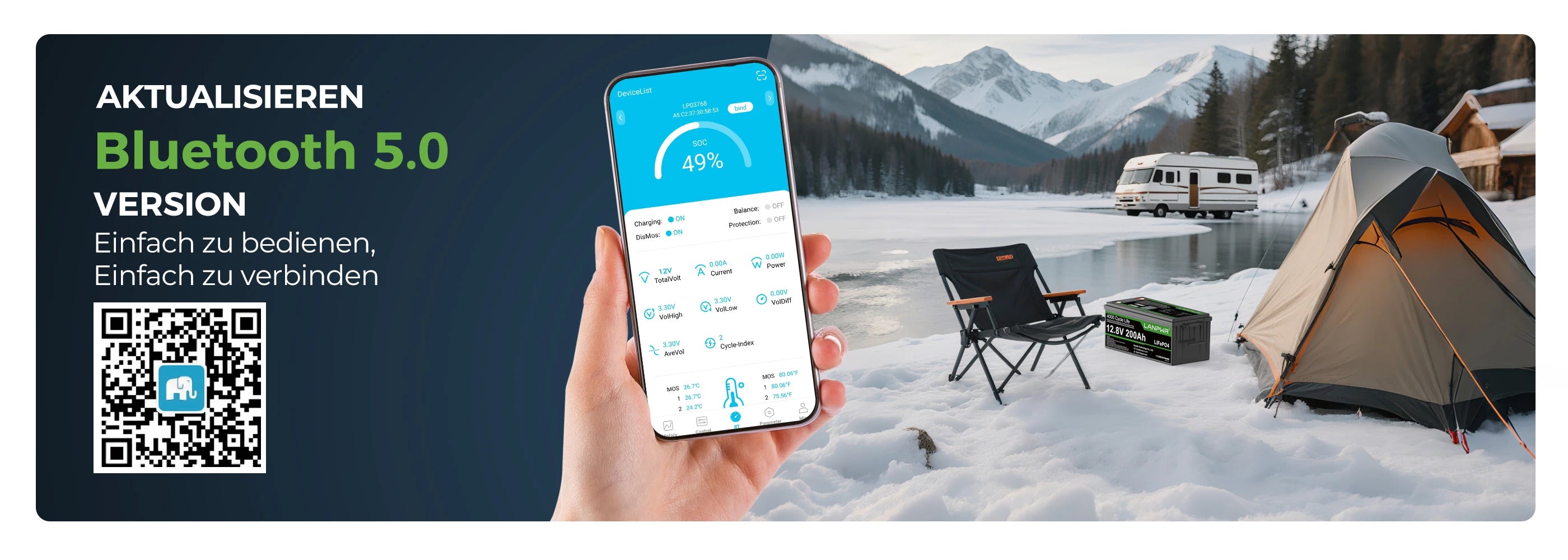 🔥Bluetooth Echtzeit-Überwachung: Lernen Sie die neue LANPWR 12V 200Ah Plus LiFePO4-Batterie mit Bluetooth 5.0 kennen. Jetzt können Sie den Status der Batterietemperatur, Spannung, Stromstärke und Kapazität jederzeit über Ihr Handy überprüfen. Außerdem können Sie die verbleibende Lebensdauer der Batterie im Auge behalten. Bleiben Sie selbstbewusst und konzentriert auf jeder Angelausfahrt, ohne sich über unerwarteten Stromverlust Sorgen machen zu müssen.