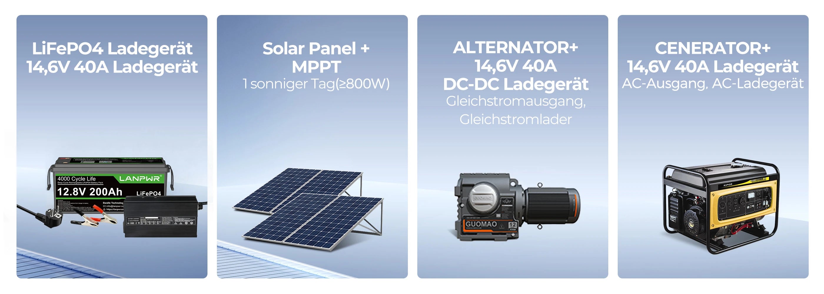 - Für mobile Anwendungen – Nutze ein DC-DC Ladegerät in Verbindung mit deinem Generator oder der Lichtmaschine, um unterwegs die Batterie effizient zu laden.