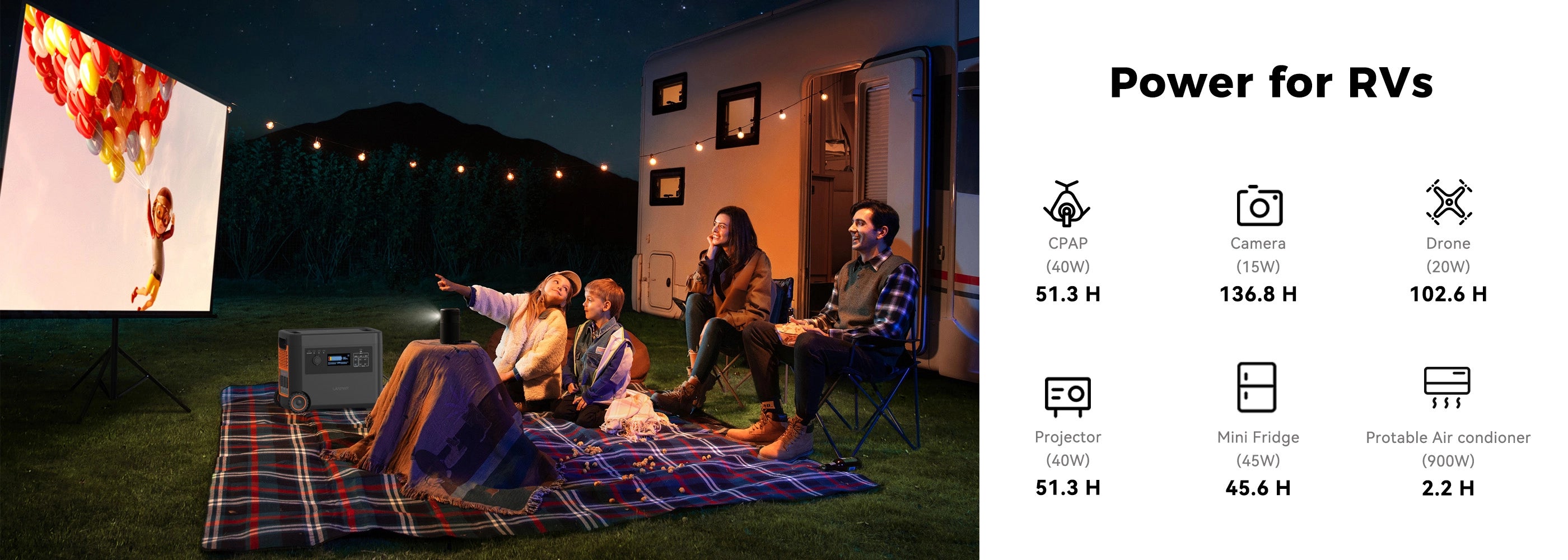 Der D5-2500 liefert 2500 W AC-Leistung (Spitzenleistung bis 4400 W) und versorgt nahezu alle wichtigen Geräte – von Kaffeemaschinen und Mikrowellen über Elektrowerkzeuge bis hin zu medizinischen Geräten. Mit 11 Ausgängen können mehrere Geräte gleichzeitig betrieben werden, wodurch eine stabile und zuverlässige Stromversorgung gewährleistet ist.